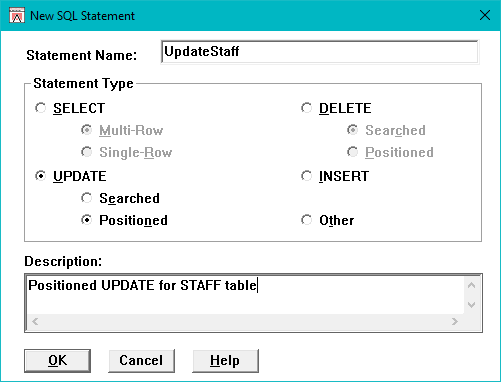 For example, below shows an example of a completed New SQL Statement dialog box that creates a positioned UPDATE statement named UpdateStaff.