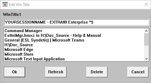 When a title-bar text is selected, it will be reformatted into a string acceptable to the matching process used by the "ESL Communication Server" library. This involves replacing certain "special" characters with an escape sequence. The re-formatted string is displayed in the entry field above the list of titles. In addition to this automatic re-formatting, you should replace the "Short-Session Name" with an tilda (i.e. "~") character, within the entry field, so the pattern matching will work with different host emulator sessions. A warning is displayed if the entry field does not appear to be been correctly amended, although you may continue.