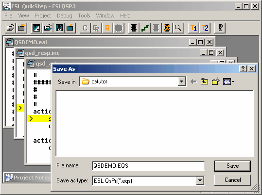 toolbar button) to start a new QuikStep project. Having confirmed that any open project may be closed, you will be presented with the Project Files dialog. The only required file is the Primary Source, which is the main ESL application source code file, which typically has the file extension ".eal". Use the "Browse..." button to navigate to and select the tutorial's Primary Source. The required file for the tutorial is "QSDEMO.EAL", which is in the "qstutor" sub-directory of the main ESL Syndetic directory.