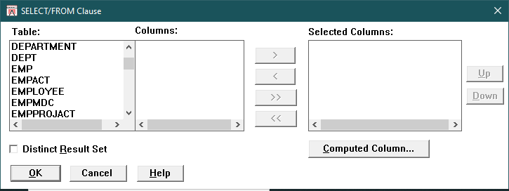 Use this dialog box to select tables and columns from the current database to include in the current SQL SELECT statement.